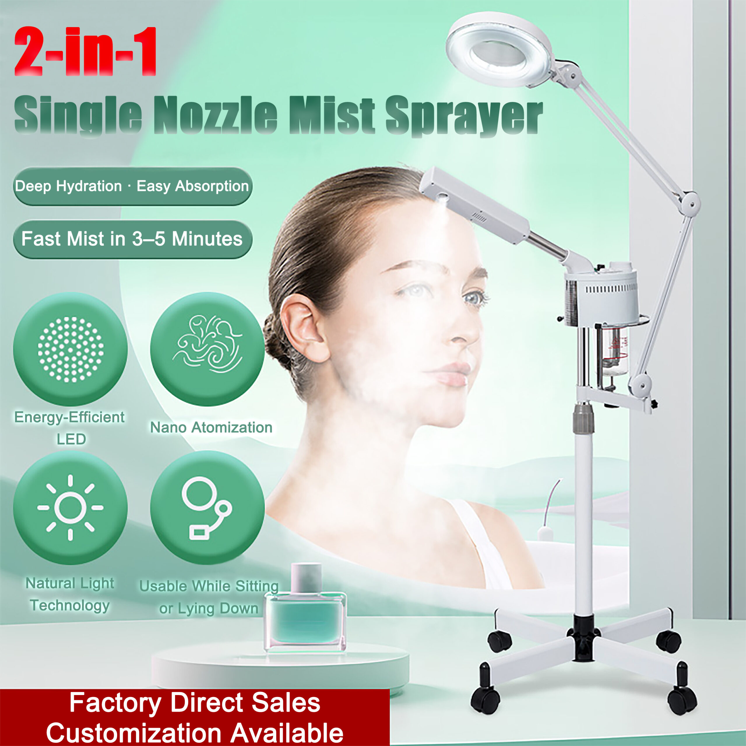 The 2-in-1 Single Nozzle Mist Sprayer is a high-performance skincare device designed for both professional spa use and personal skincare routines. It combines nano-atomization facial steaming with an energy-efficient LED magnifying lamp, offering comprehensive skin treatment in a single device.