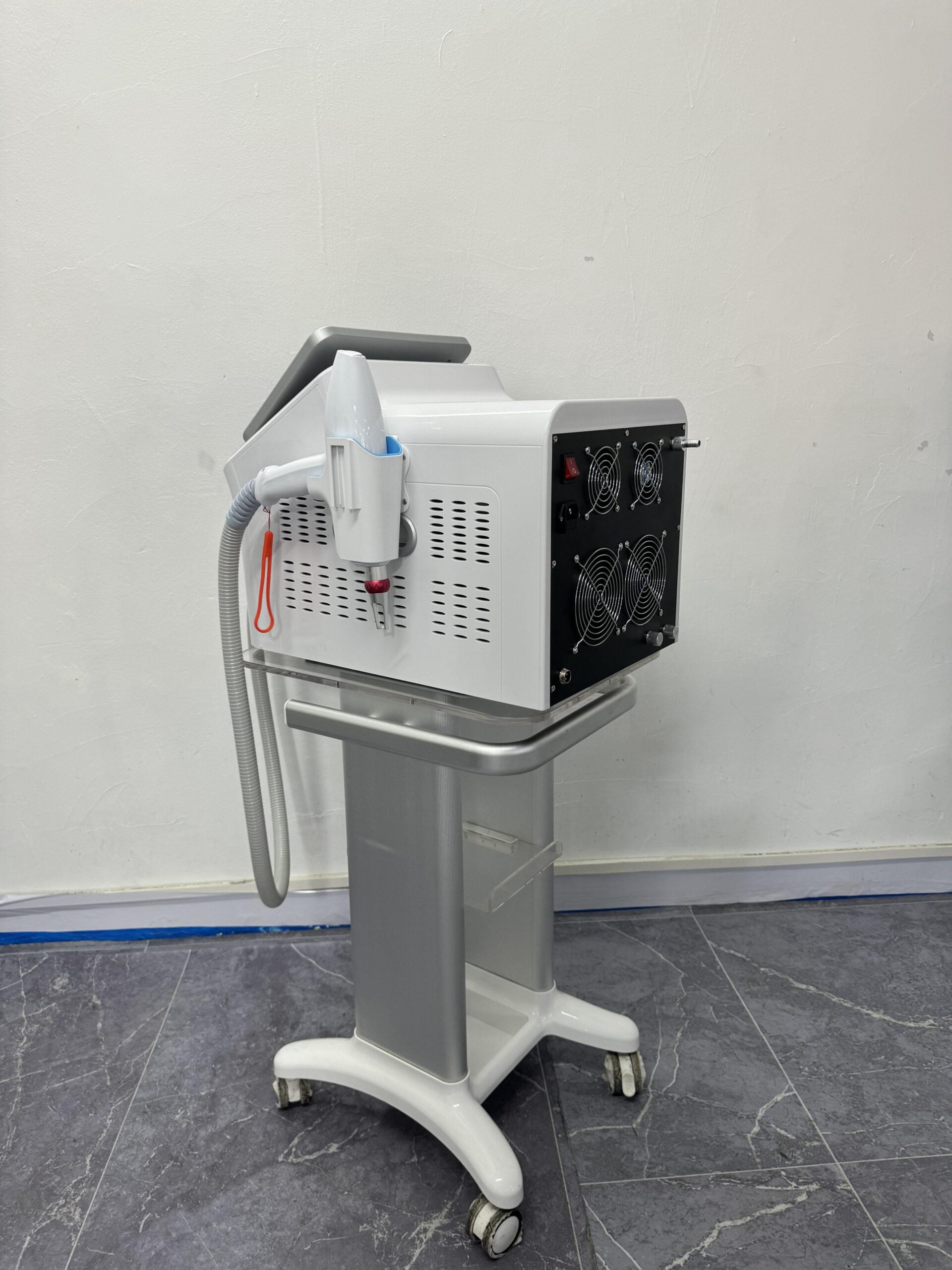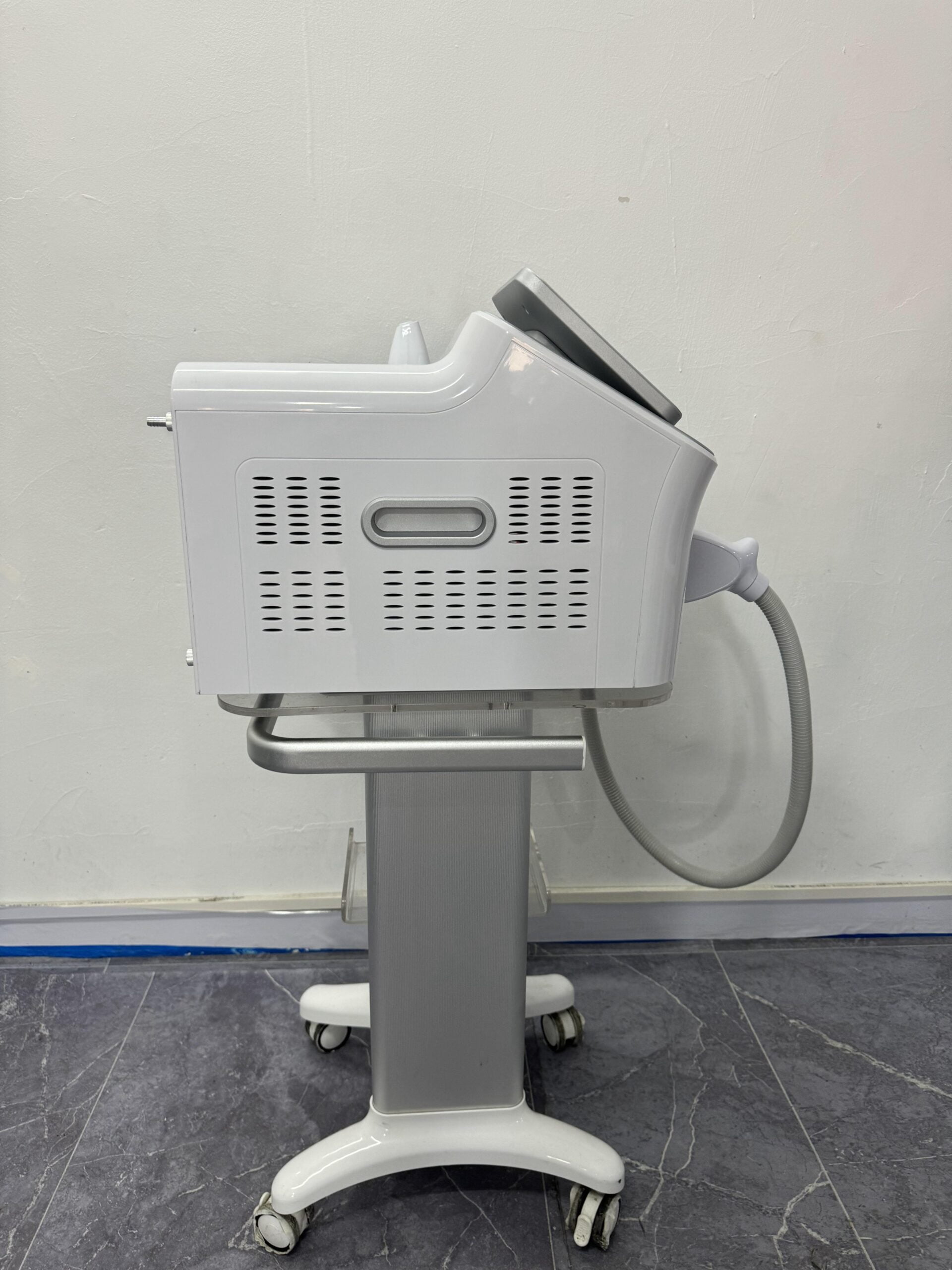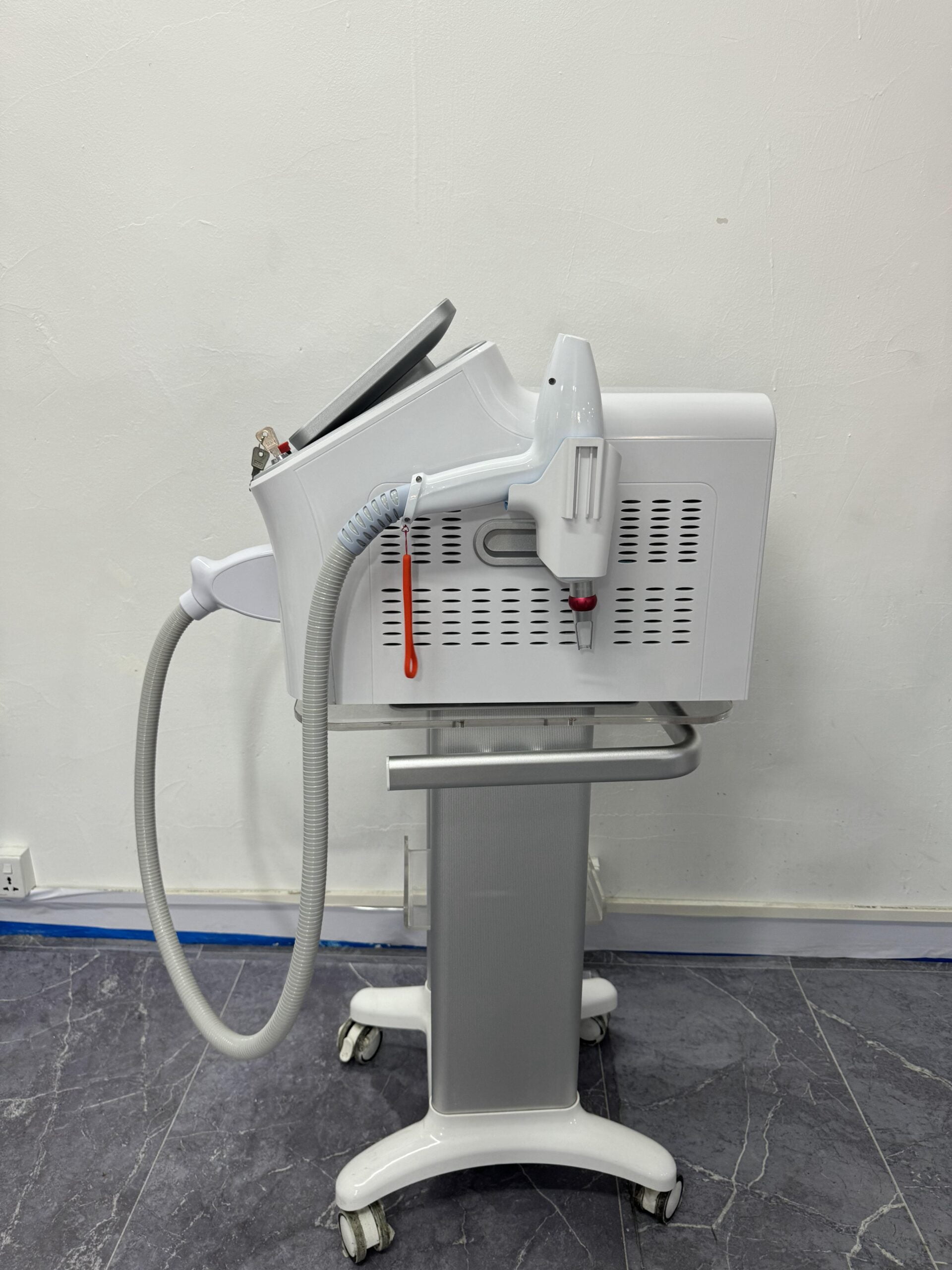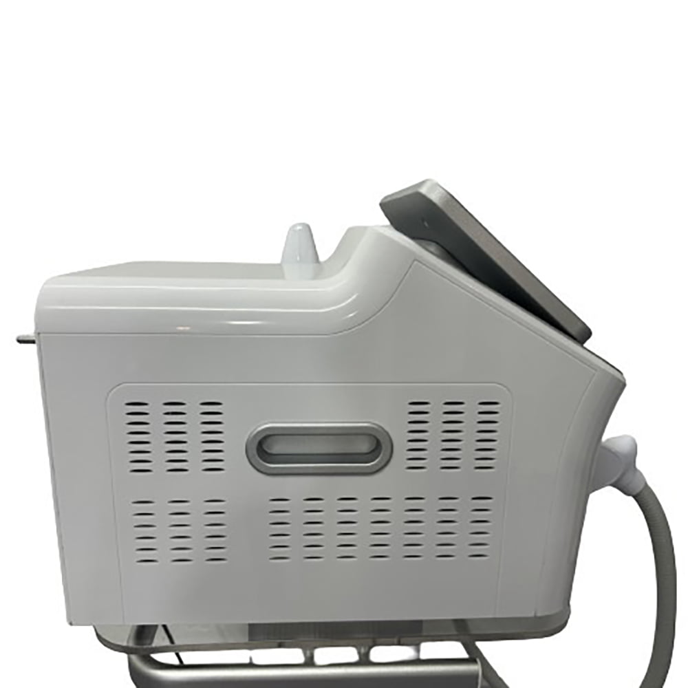 an advanced laser system designed to deliver exceptional performance in aesthetic treatments with a focus on hair removal and skin rejuvenation. This sleek device boasts a lightweight design, optimized for mobility with the convenience of a dedicated trolley.