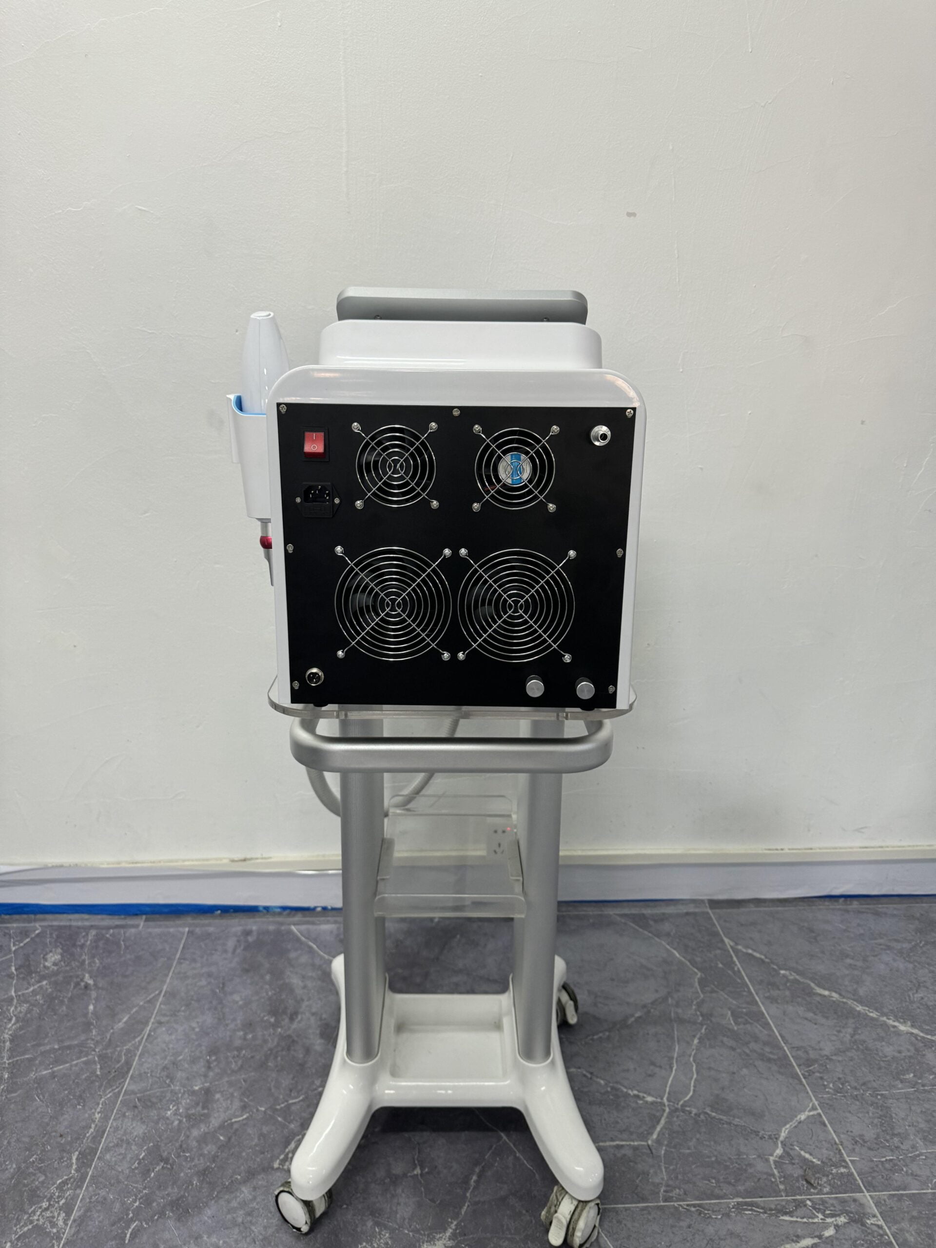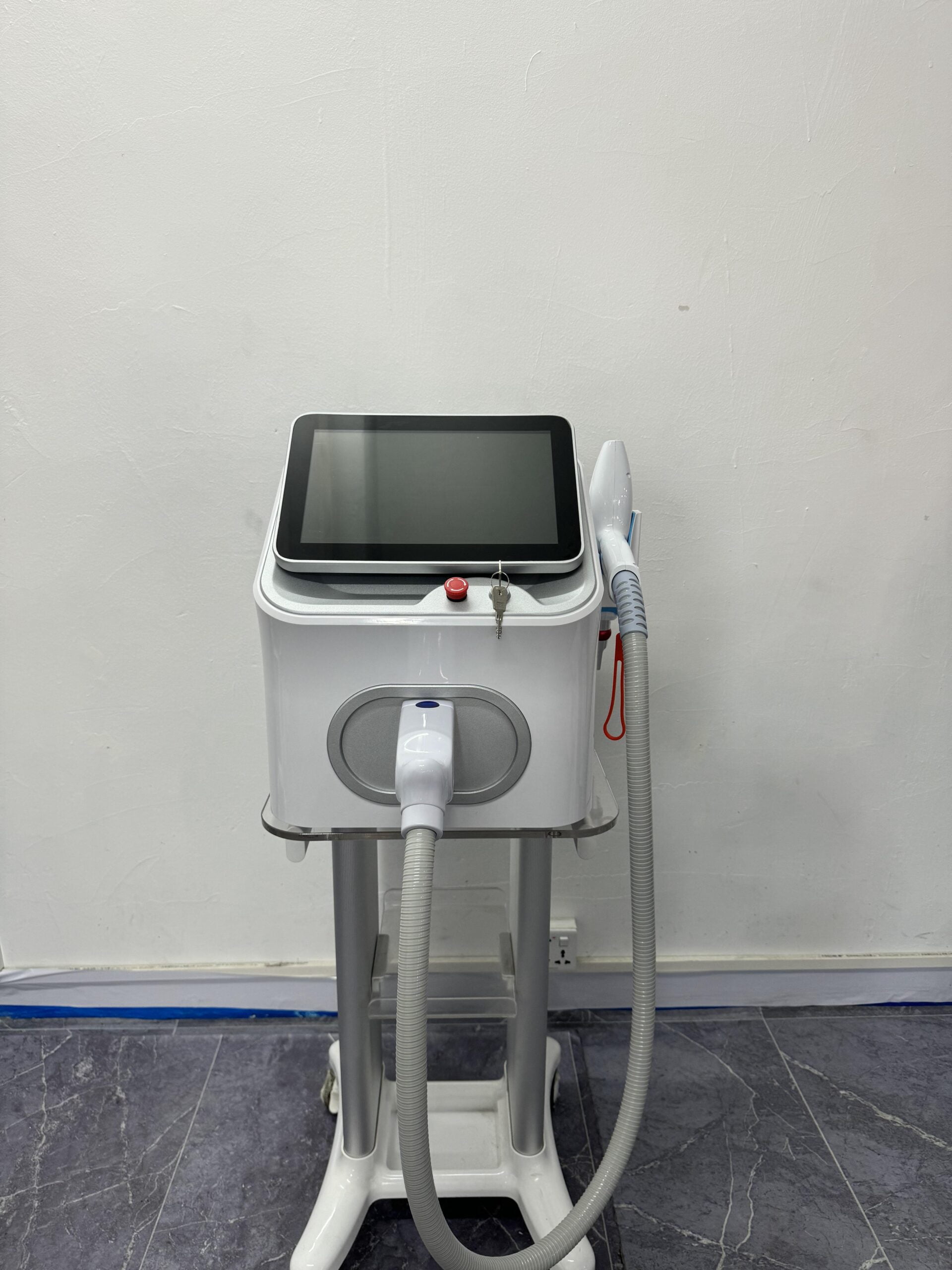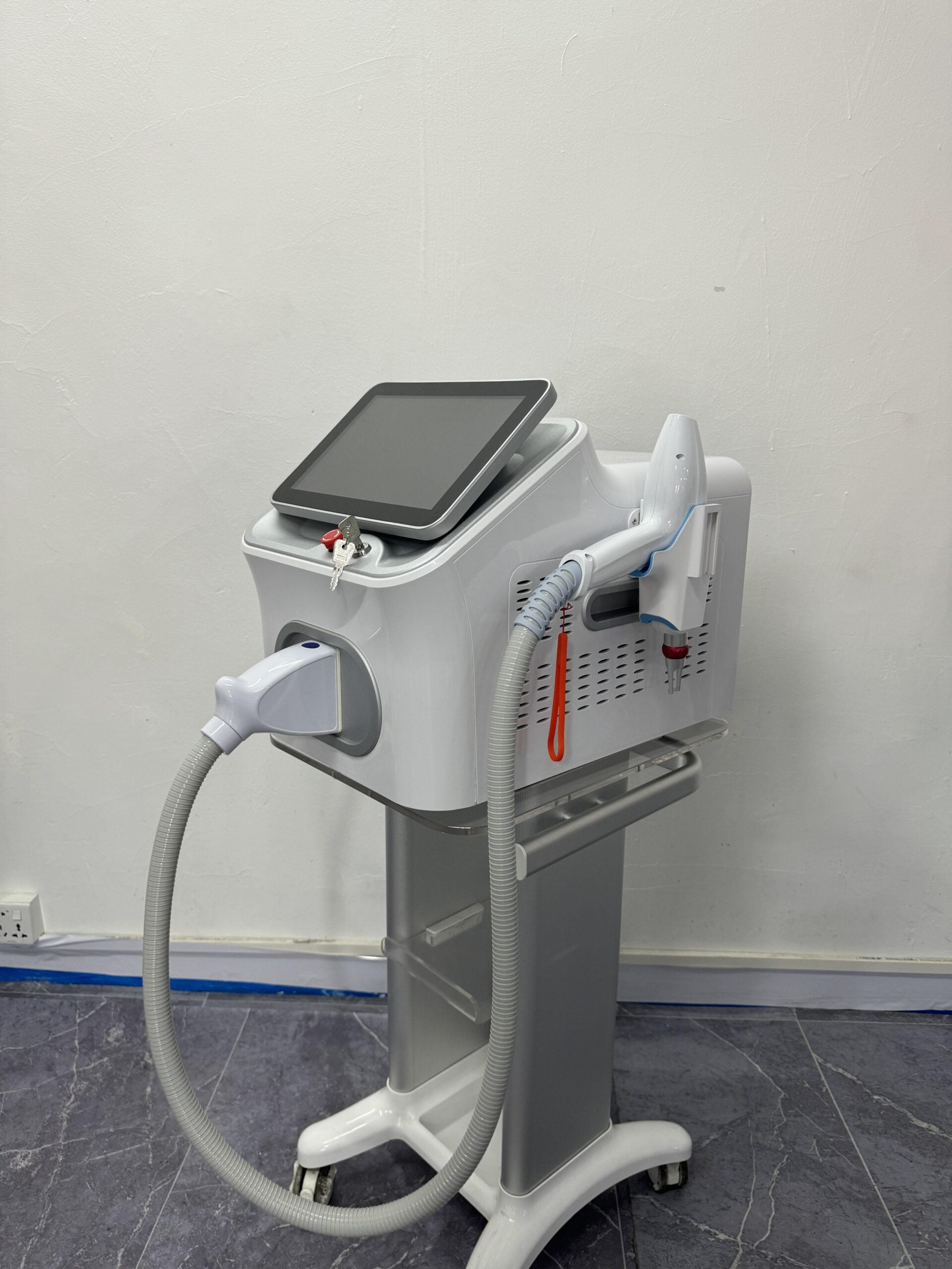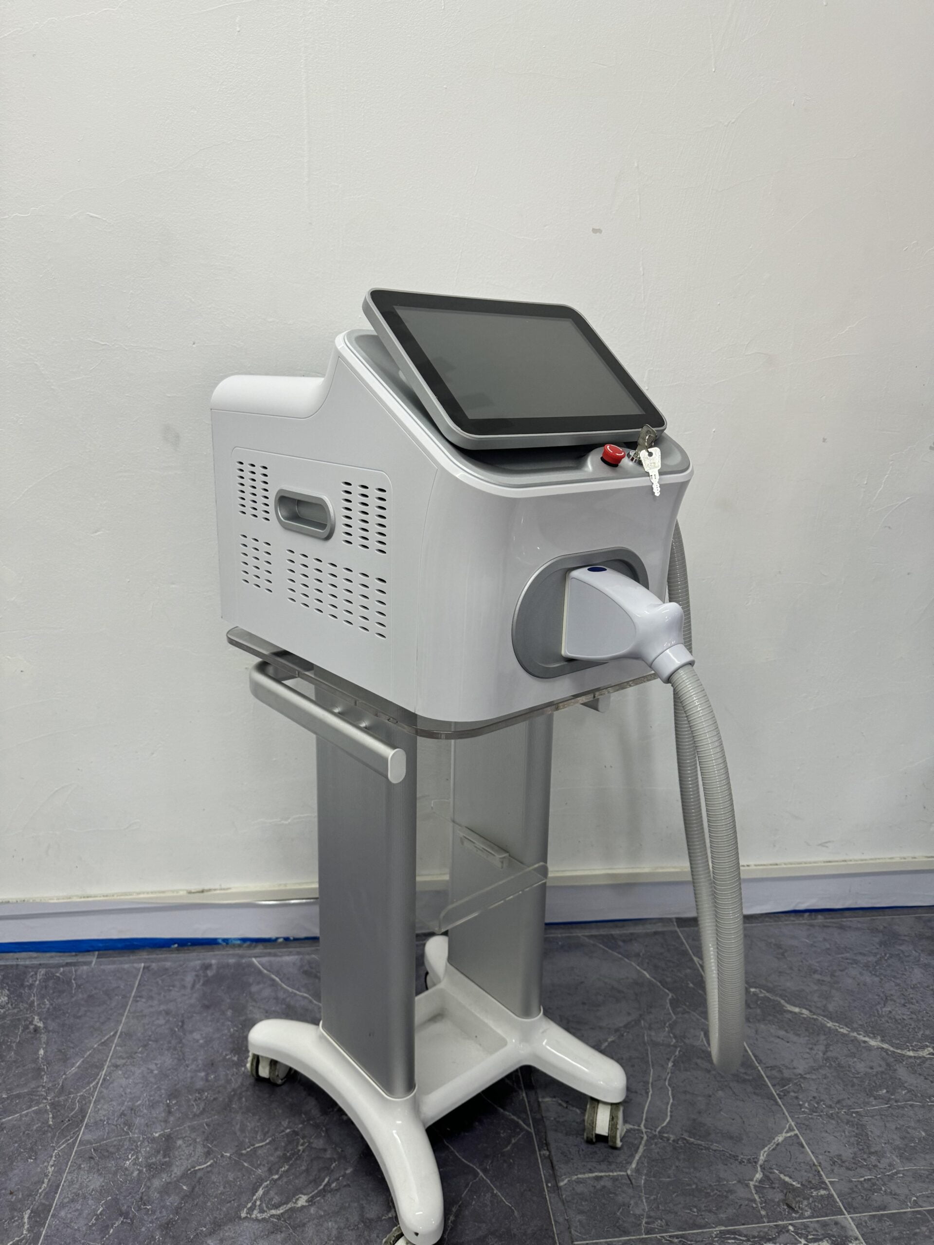 an advanced laser system designed to deliver exceptional performance in aesthetic treatments with a focus on hair removal and skin rejuvenation. This sleek device boasts a lightweight design, optimized for mobility with the convenience of a dedicated trolley.